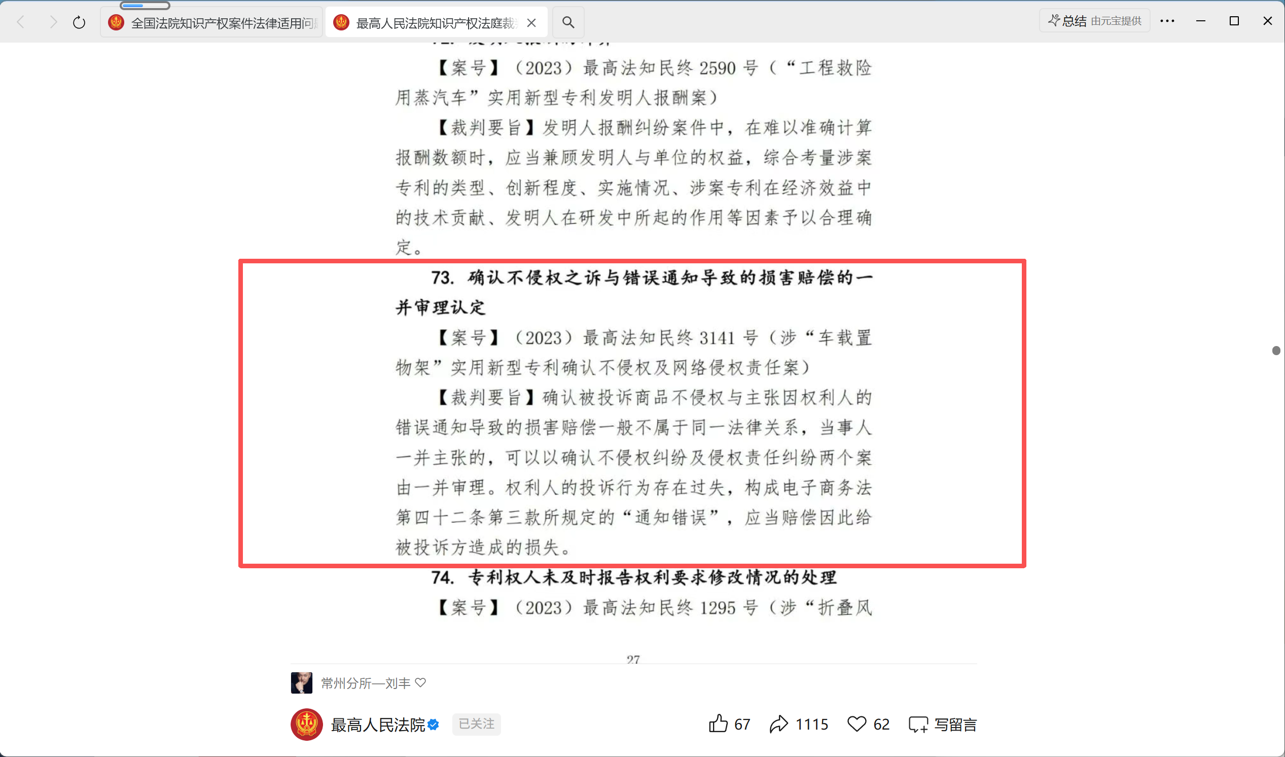 2026年4月21日最高人民法院发布的《全国法院知识产权案件法律适用问题年度报告(2025)摘要》,其中专利案件审判之案例2(农药登记中实施农药专利的性质认定),由知识所张苏沛、施婷婷律师主办。